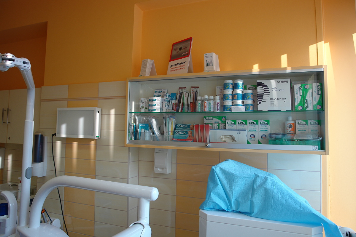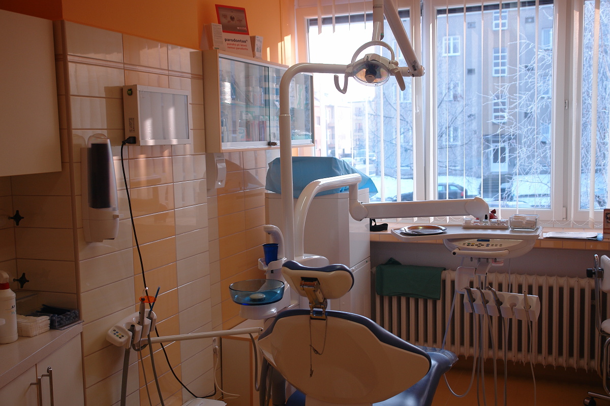 Příjemné prostředí ordinace s moderním vybavením pro stomatochirurgiké ošetření, implantaci, panoramatický rentgen nutný k vyšetření přímo v ordinaci.